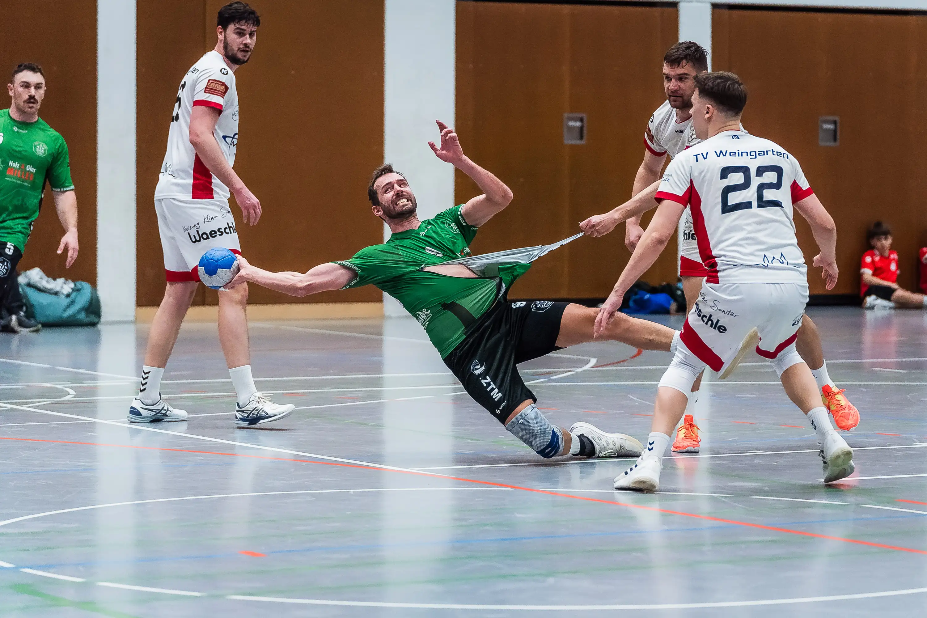 Die am Sonntag um 17.00 Uhr angepfiffene Partie startete zunächst sehr ausgeglichen. Zu Beginn spielten die Gäste im Angriff, unter Regie Jörg Lützelbergers, sehr konzentriert bis zur klaren Torchance durch, die zunächst von dem sehr gut aufgelegten Lindauer Kreisläufer Simon Wiedrich treffsicher verwandelt wurde. Doch die Vogter ließen sich von dem selbstbewussten Auftreten der Lindauer nicht verunsichern und glichen nach jedem Gegentreffer aus. In der sechsten Minute bekamen die Herren in grün erstmals die konsequente Linie des Schiedsrichtergespanns mit der Hinausstellung Norbert Knechtels zu spüren, der bei der geahndeten Abwehraktion einen Gegenspieler lediglich leicht am Trikot gezogen hatte. Trotz Unterzahl spielten die Lindauer Akteure unbeirrt weiter und konnten während einer Vogter Unterzahl sogar eine kurze Zwischenführung (4:6) herausspielen. Diese konnte bis zum Zwischenstand von 12:14 in der 23. Minute gehalten werden. Nun begann das Angriffsspiel wegen der beschränkten Wechselmöglichkeiten auf den Rückraumpositionen zu bröckeln. Aufgrund der Ballverluste durch Unkonzentriertheit im Passspiel, Fehlwürfen und dem Einbrechen der Rückzugsbewegung nach den besagten Fehlern, konnten die Gastgeber über schnell herausgespielte Konter Profit aus dieser Lindauer Schwächephase ziehen und bis zur Halbzeit mit 16:14 in Führung gehen.